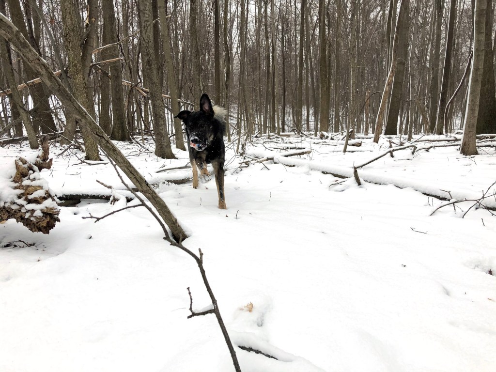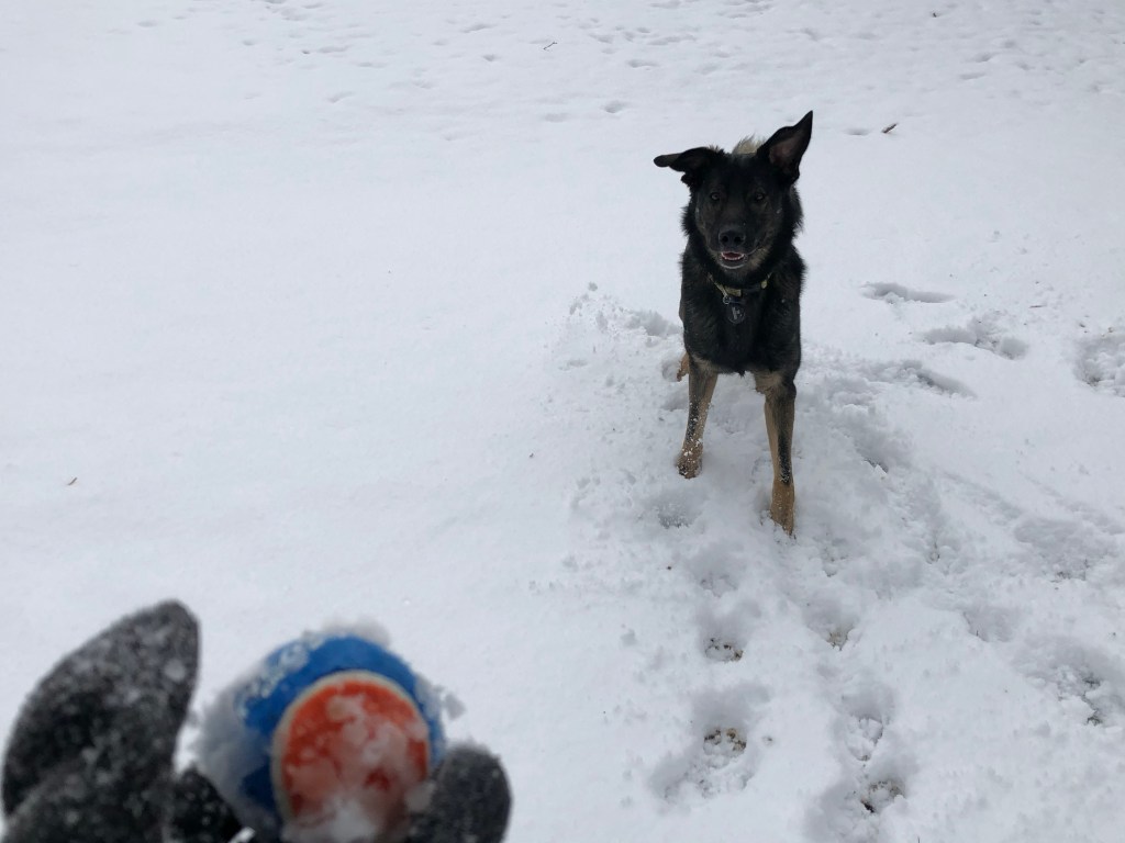 Goose loves to play outside especially in the snow!I brought his favorite ball to go play in the woods!He loves it when we go play catch in the woods.Goose is amazing at catching the ball mid air.And he loves showing off his pearly white teeth!But no matter how far he runs…He always comes backbut he never wants to leave and gives me these big puppy dog eyes when its time to goBut loves beating me home so he can get warm!
